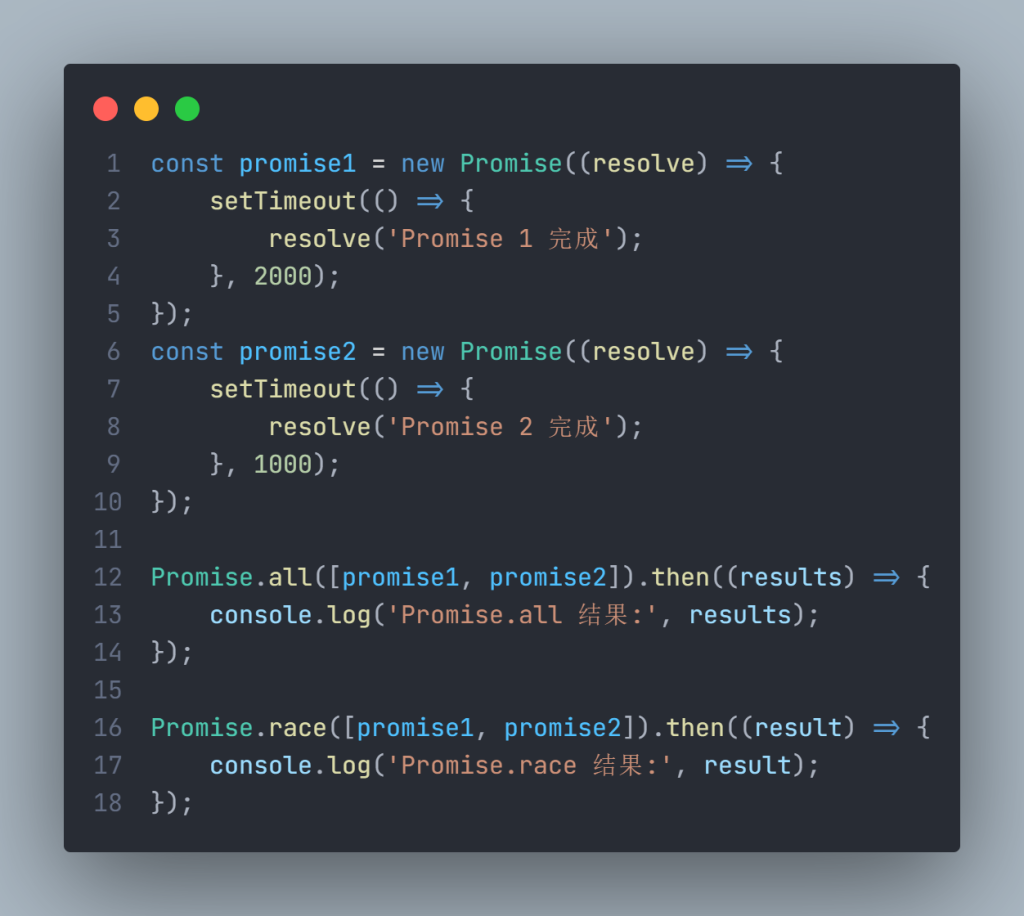 Promise.all:接收一个 Promise 数组作为参数,只有当数组中所有 Promise 都成功时,它返回的 Promise 才会成功,结果是一个包含所有成功结果的数组;如果有一个 Promise 失败,它返回的 Promise 就会失败,结果是第一个失败的 Promise 的错误信息